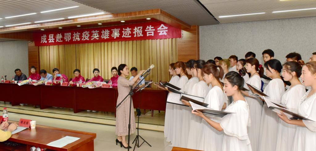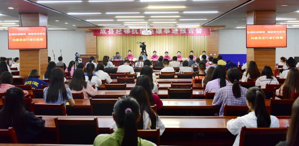 成县人民医院副经理赵江,甘肃第六批援鄂医疗队队员、成县人民医院呼吸消化病区医师帖二艳、高小波及重症医学科护师王文秀,成县慈善协会会长杨国强、副会长兼秘书长张小宁、副会长刘志坚、李明,成县同谷书画院经理王沛强,成县中医院妇联主席侯文佳及公司200多名师生代表参加了报告会。副董事长张勇主持报告会。