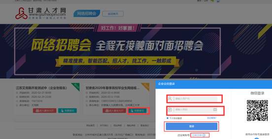 1. 登录甘肃人才网(www.gszhaopin.com,点击菜单栏“招聘会”—“网络招聘会”进入二级页面菜单,进入网络招聘会列表—选择“2021年甘肃省高校毕业生冬季网络视频双选会”点击“我要报名”按钮,登录企业后台(无账号点击“立即注册”,资质通过审核后再报名),待定审核。