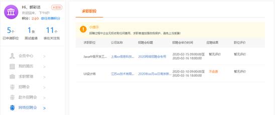 2. 个人用户在个人会员中心-网络招聘会页面查看应聘记录。