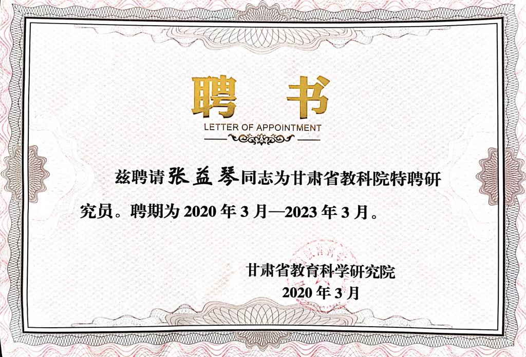 公司副经理张益琴教授受聘甘肃省教育科学研究院特聘研究员