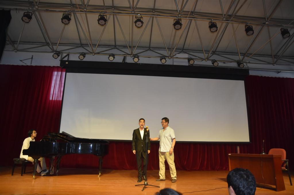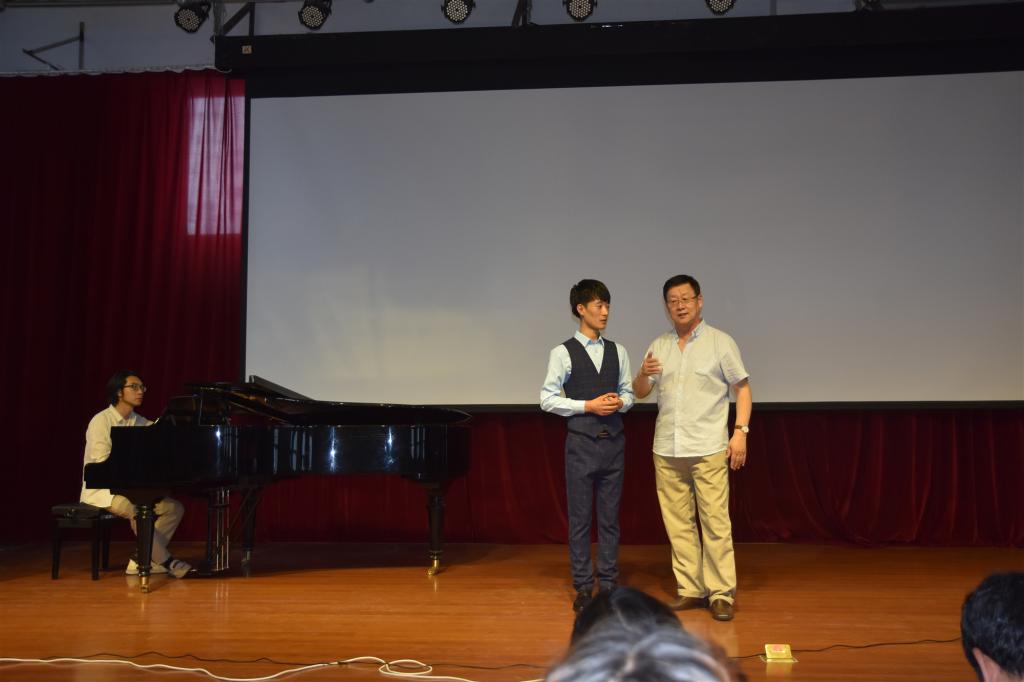当晚8点,“仲夏之声——朱东生教授员工音乐会”在北校区礼堂如期举行。先由李时雨以一首司马相如作词、李砚作曲的《凤求凰》将音乐会徐徐拉开帷幕,接着是选自《大唐贵妃》的《梨花颂》……崔秋月演唱了《玫瑰三愿》《青春舞曲》等歌曲带给了我们美的享受,朱教授的两位研究生都以她们精湛的演唱技巧赢得了全场师生的阵阵掌声。公司员工尚玉芳和吴玉娇同学演唱了《在那高山顶上》和《一杯美酒》。青年教师王博老师友情献唱的卡尔蒂洛意大利民歌《负心人》将音乐会推向了高潮。最后,朱教授的员工崔秋月以一首《L’altra note in fondo al mare》将音乐会圆满结束。