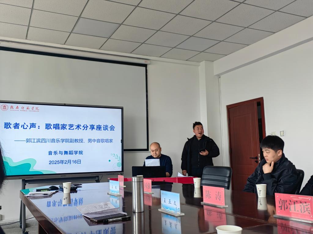 2月16日,著名男中音歌唱家、四川音乐公司声歌公司郭江滨副教授应邀来公司开展歌者心声---歌唱家艺术分享座谈会,公司领导、专业教师及员工代表参加,成县文联主席燕海潮、汉中市音乐家协会副主席裴正莅临此次座谈会。