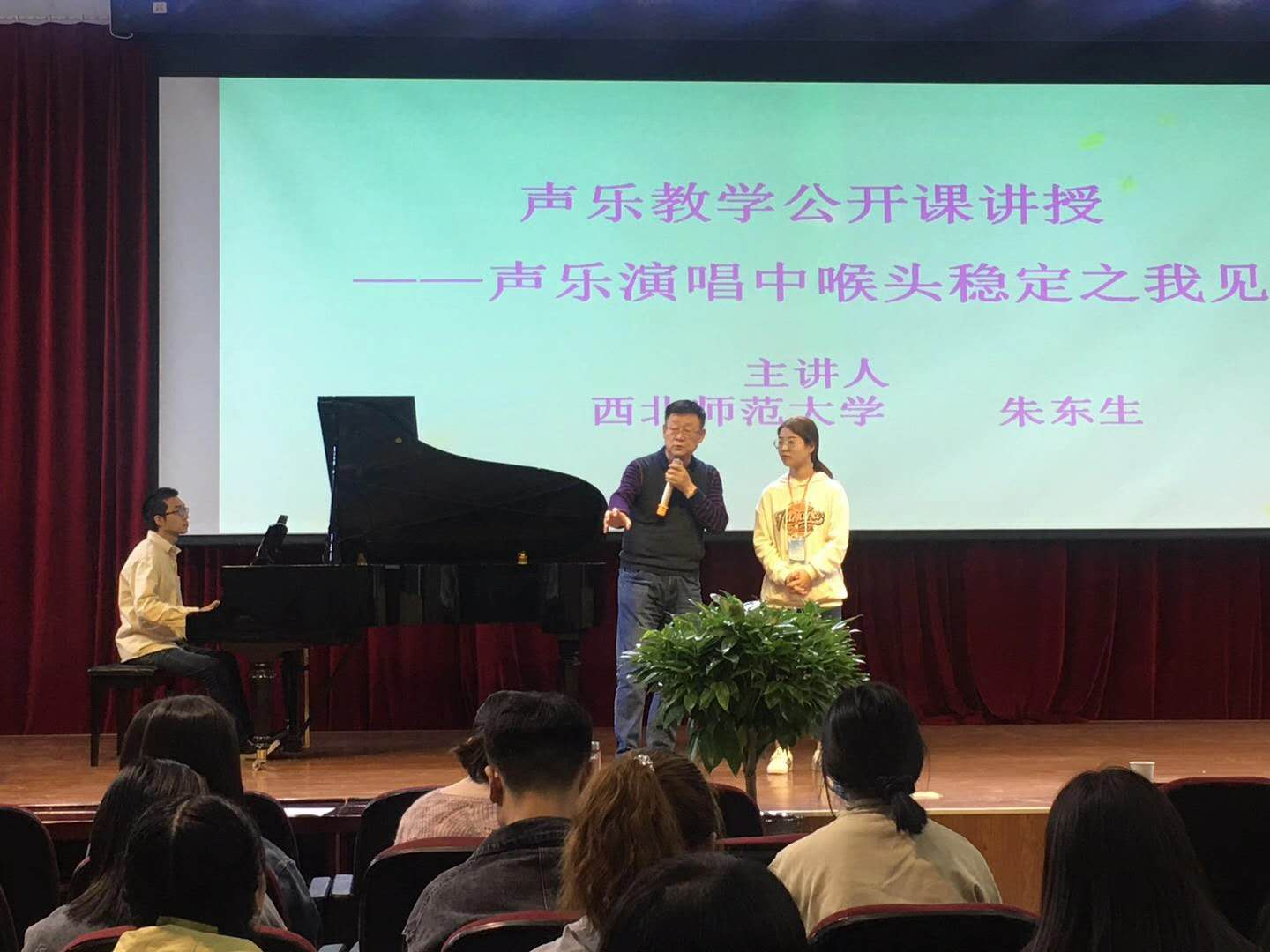 28日,朱东生教授作了题为“声乐演唱中喉头稳定之我见”的学术报告。在报告中,他从自身声乐学习最初对歌唱喉头的认识入手,对喉头器官结构、声带开合、国内外著名歌唱家演唱中喉头的表现和运用等方面进行了深入阐释和分析,重点对歌唱中喉头稳定对歌唱的重要性、以及喉头稳定的练习方法和技巧作了讲解,他还对4名音乐教育专业员工的声乐演唱进行了现场指导,并悉心解答了师生在声乐学习中的疑问。柳廷信作了题为“打造民族品牌,扩大西部影响——从高屋建瓴的态势审视裕固族音乐”的报告。他就音乐大众传媒方式,结合裕固族音乐视频、音频、语言三位一体特点,从裕固族原生态民歌、裕固族民歌的整理改编、裕固族音乐的创作、裕固族音乐的传播、裕固族音乐的未来展望等五个方面对我省独特的少数民族裕固族音乐进行了全方位论述和分析。太阳集团122cc副经理张益琴教授主持报告会。
